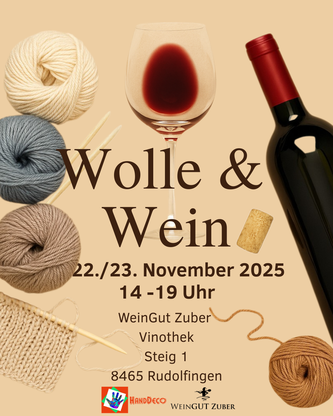 Wolle & Wein ist eine gemütliche Hausmesse im WeinGut Zuber, bei der feine Weine, edle Garne und gute Gespräche zusammenfinden – ein Ort für Genuss, Inspiration und Begegnung. Komm zum Stricken, Häkeln und Wein degustieren – bei Wolle & Wein treffen Handarbeit, Genuss und gemütliche Atmosphäre aufeinander.